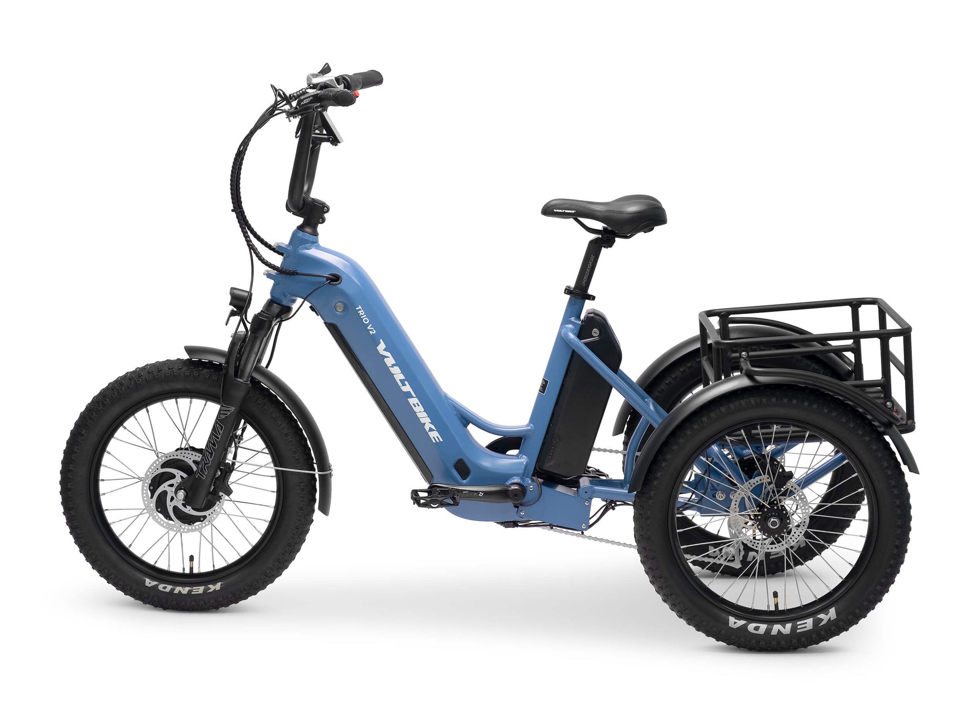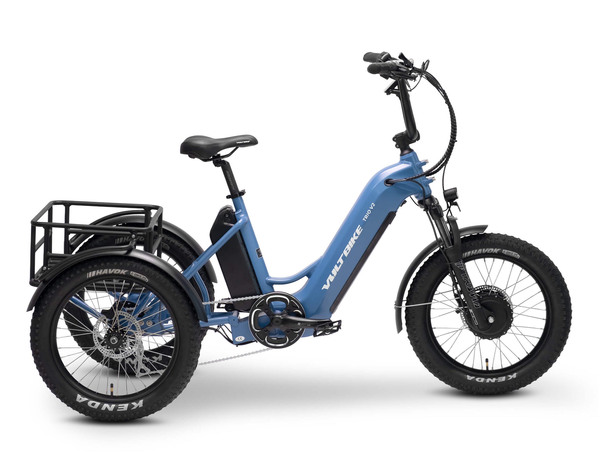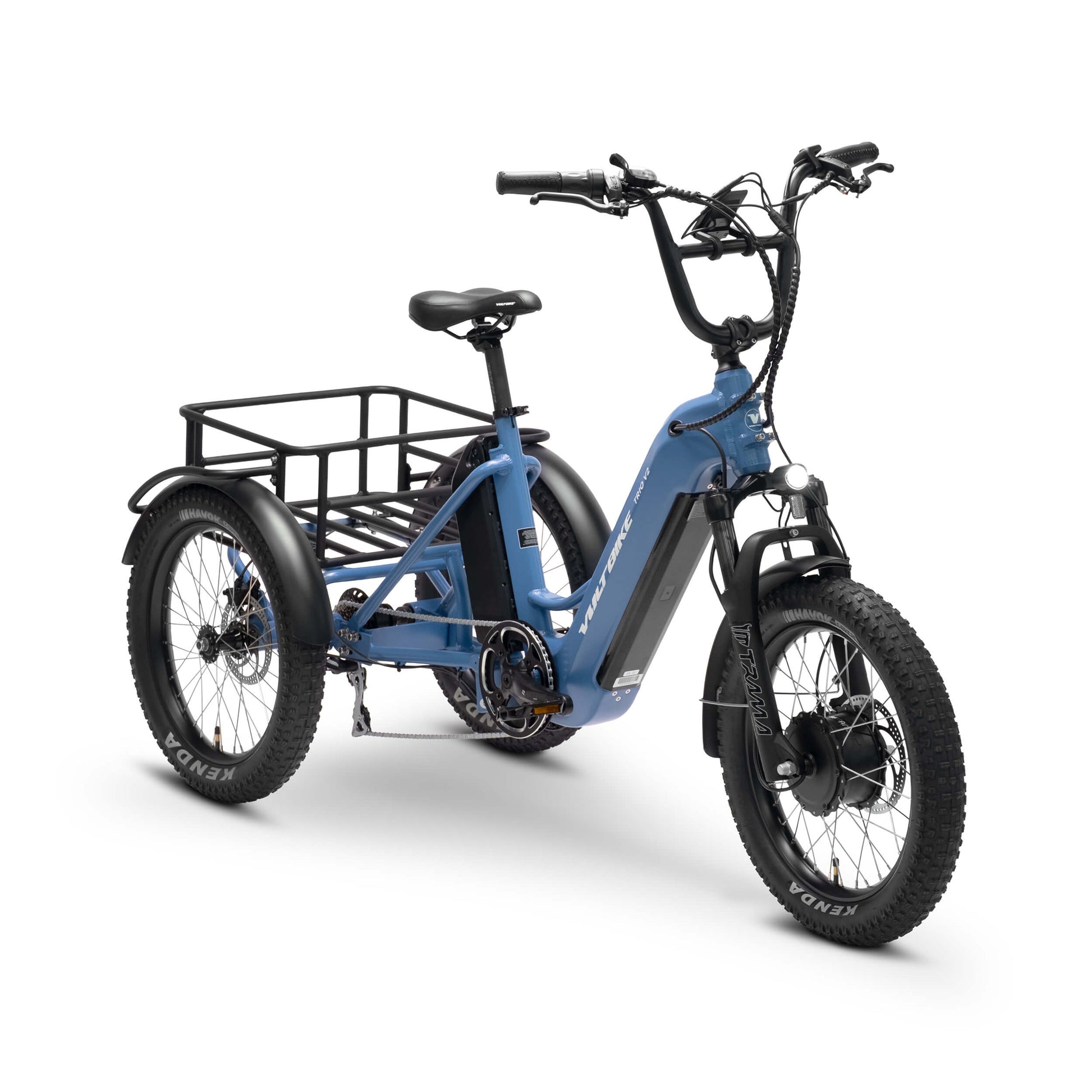 Fat tire bikes provide improved grip and traction on the most troublesome terrain by adding extra contact surface. The VoltBike Trio V2 comes with 20" x 3" front and rear tires Kenda Havok for improved corner stability.