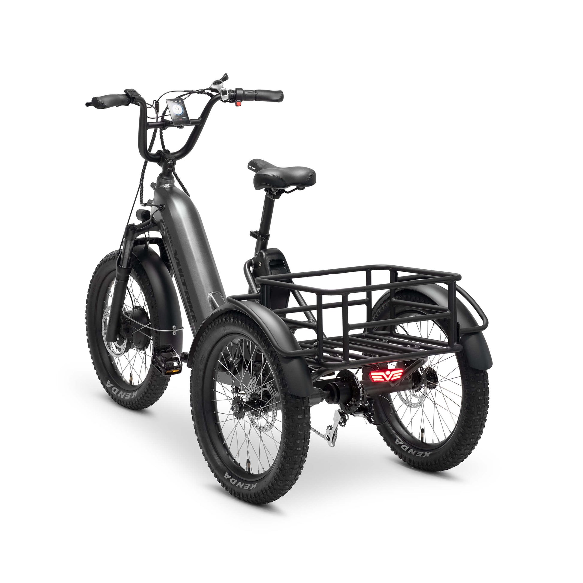 VoltBike Trio V2 is using Bengal Ares 7+ hydraulic front and dual rear disc brake design. The front wheel is using 180mm rotor. Each rear wheel is equiped with independent 160mm rotor. The rear wheels braking is controlled by the right hand side brake lever located on the handlebar. The new dual brake rear system provides improved stopping power compared to the traditional single rear brake design.