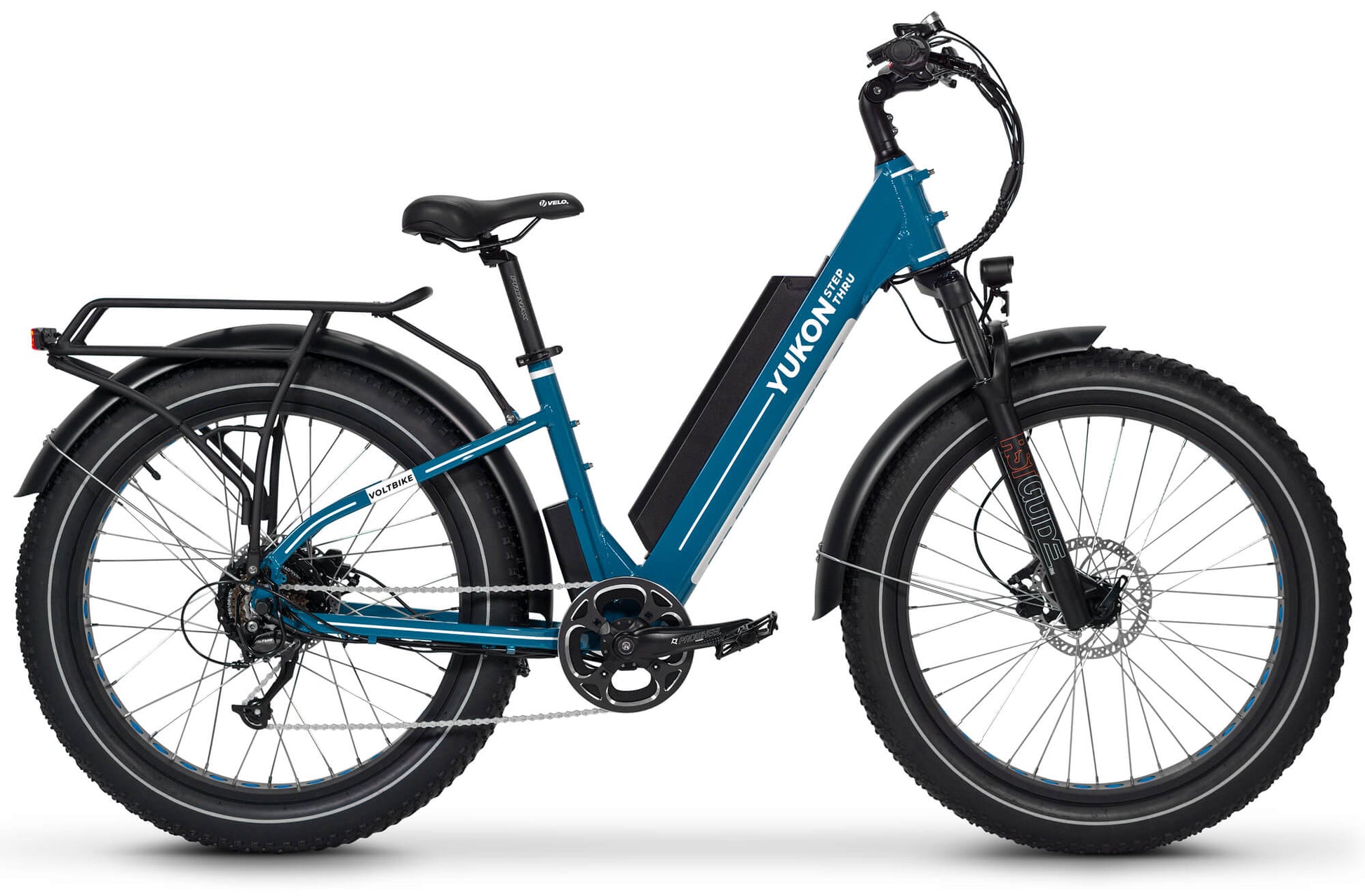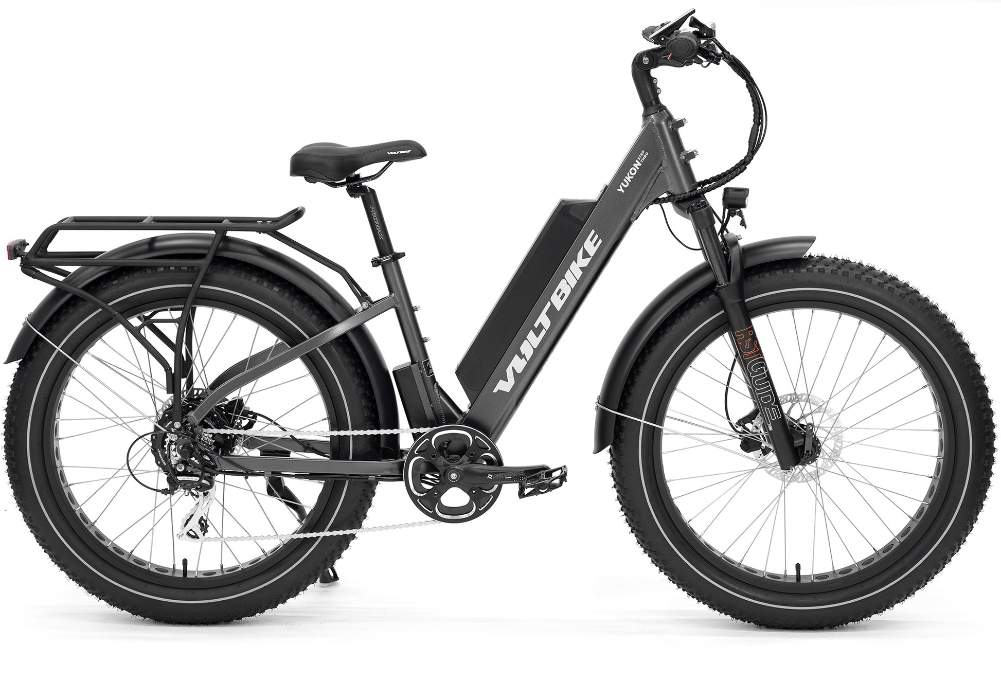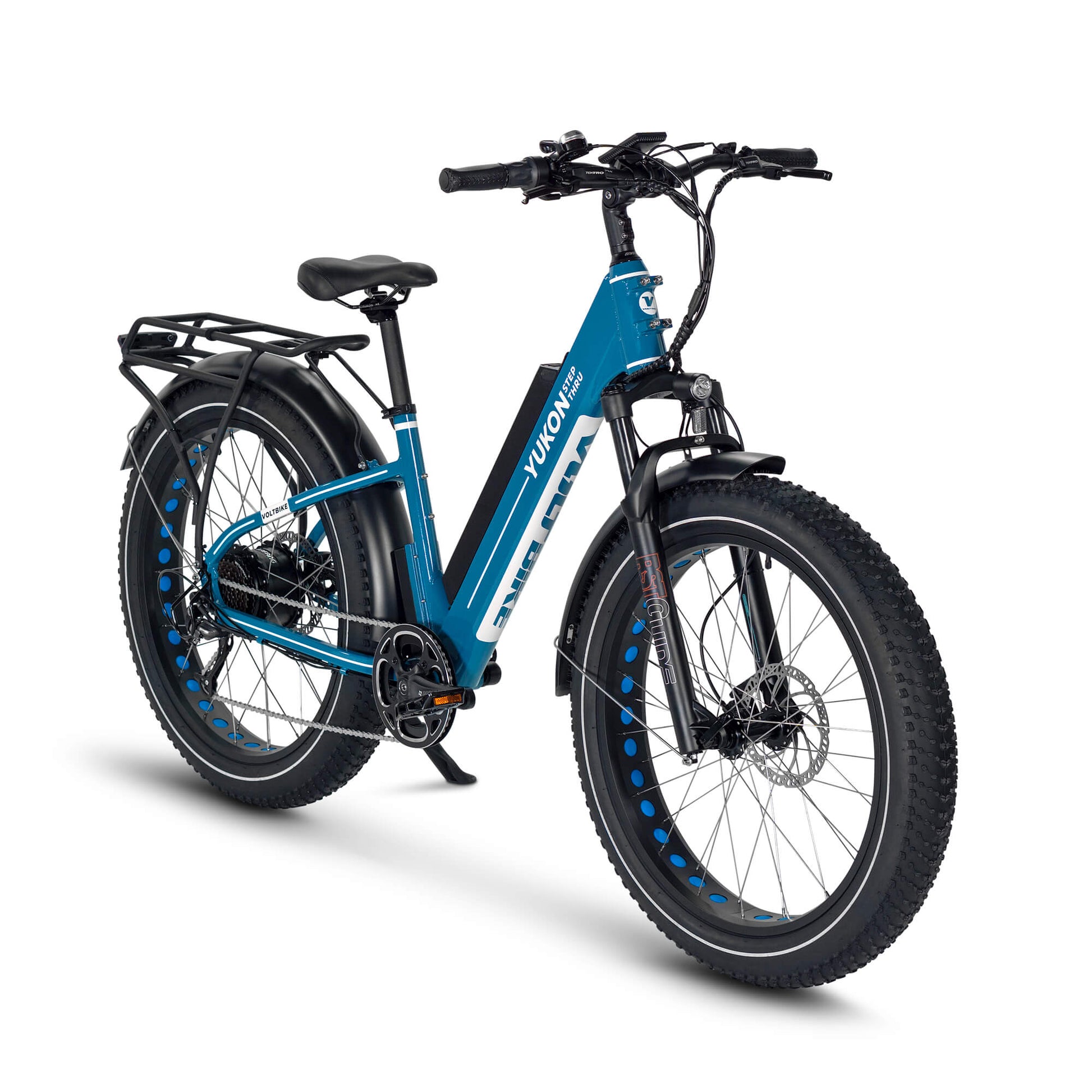 Voltbike Yukon Step-Thru comes standard with lockout suspension Mozo FatMan which can handle up to 4.8 inch tire. Designed for quick release axles and bolt on axles for ease of use. 135mm dropout, 32mm stanchions, 210mm steerer tube, 90mm travel. Weighing a remarkable 7 lbs., this fork is ready to tackle anything you throw at it.