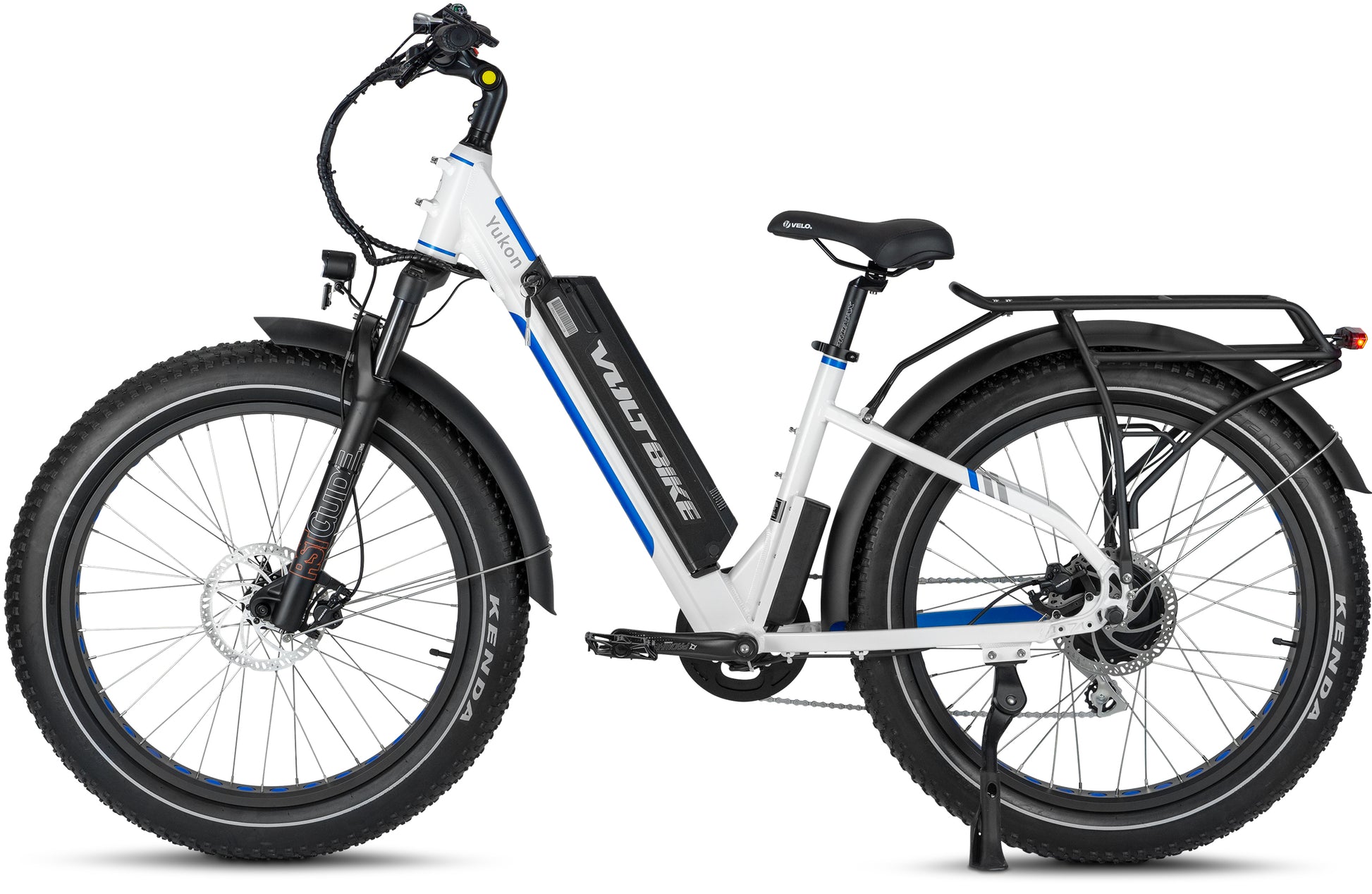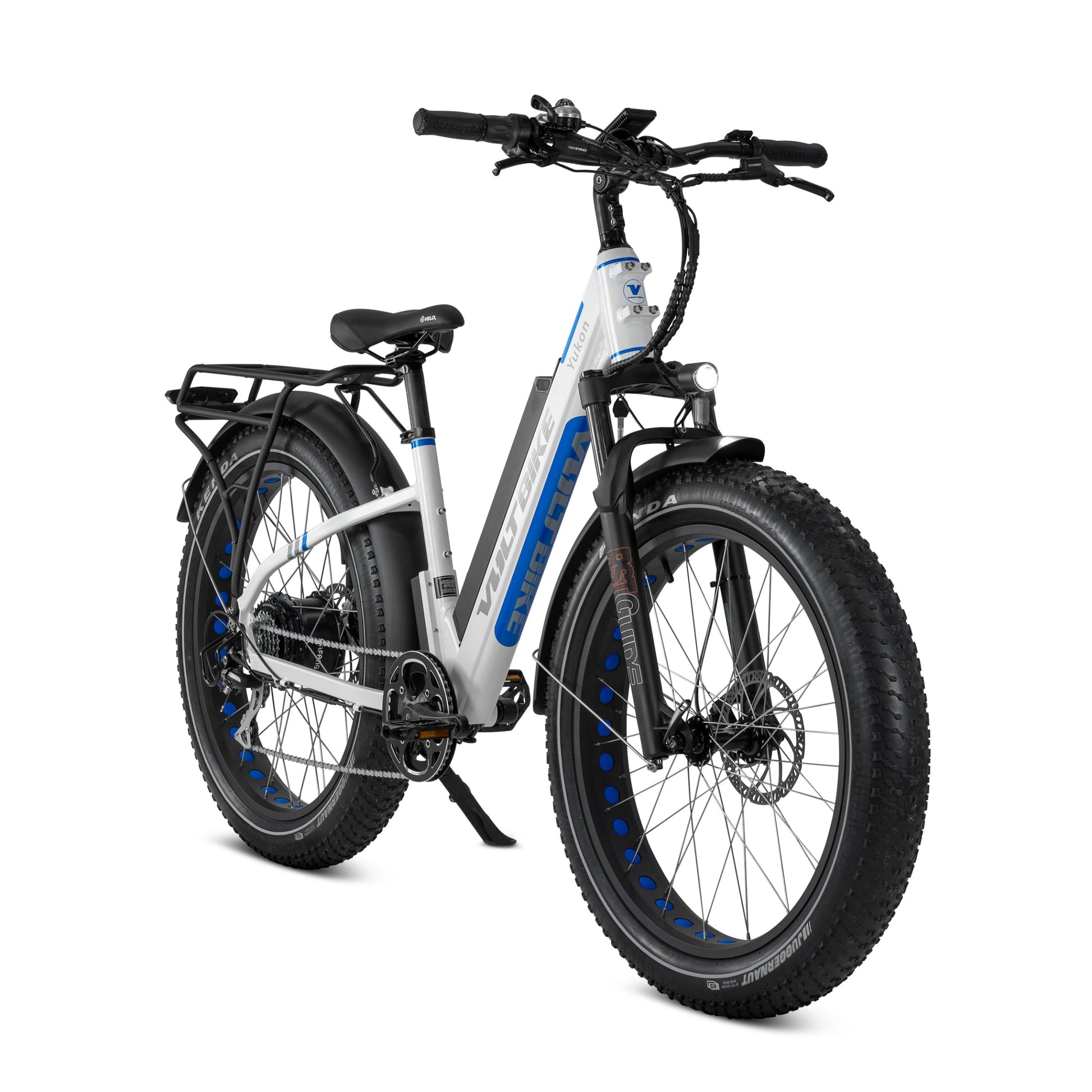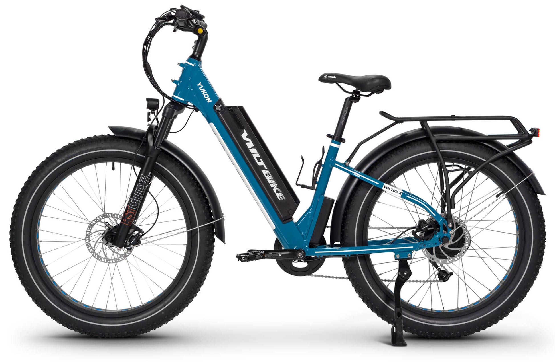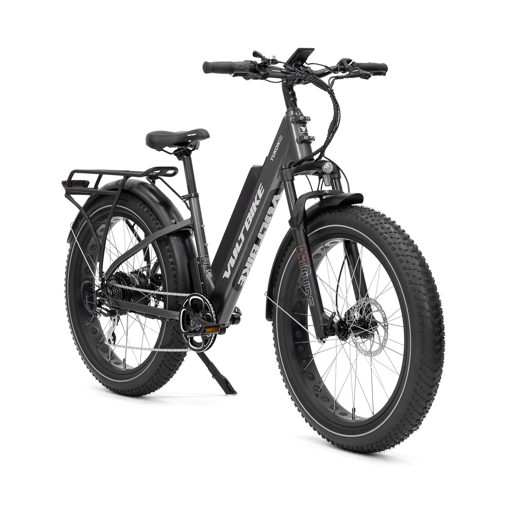 Voltbike Yukon Step-Thru comes standard with lockout suspension Mozo FatMan which can handle up to 4.8 inch tire. Designed for quick release axles and bolt on axles for ease of use. 135mm dropout, 32mm stanchions, 210mm steerer tube, 90mm travel. Weighing a remarkable 7 lbs., this fork is ready to tackle anything you throw at it.