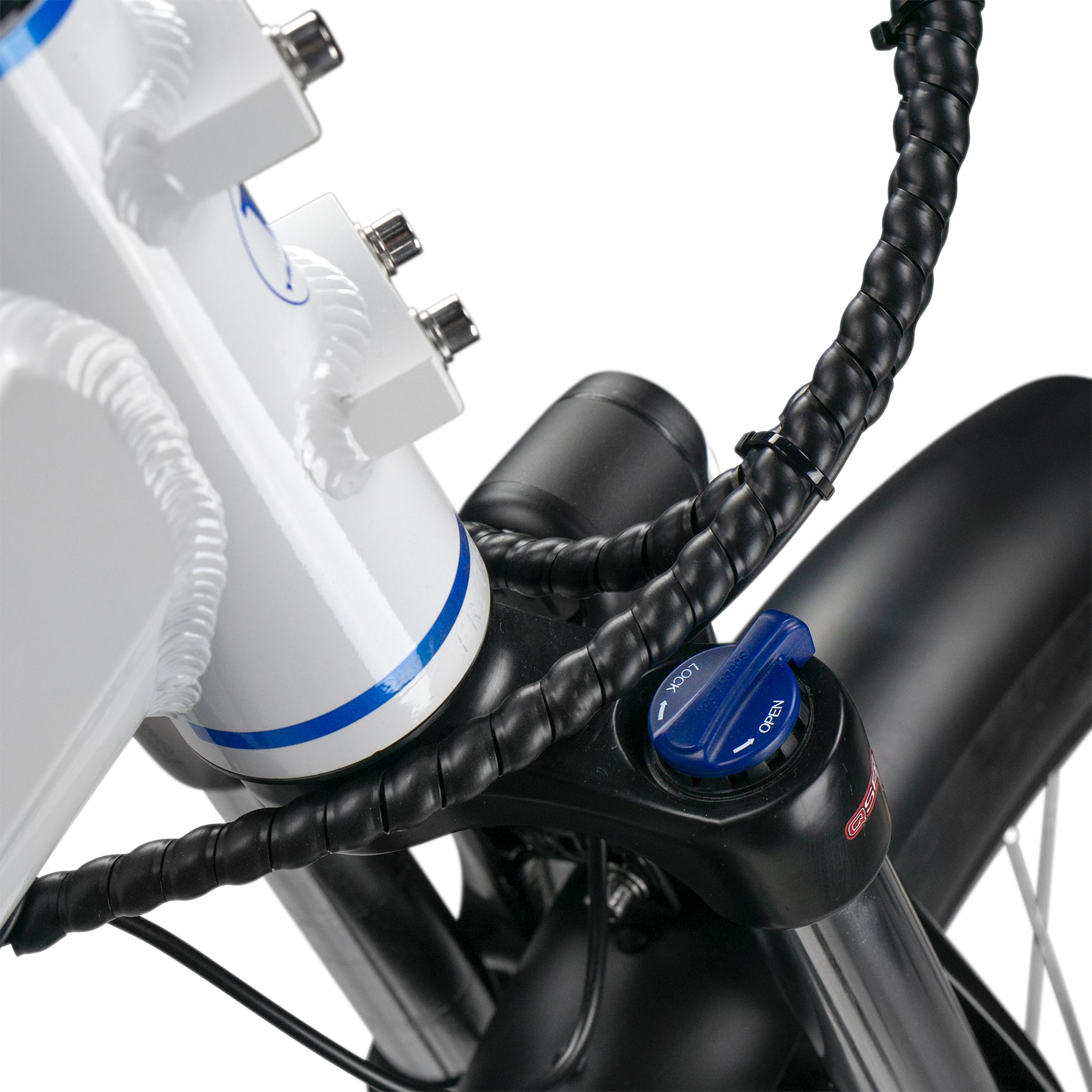 The Voltbike Bravo comes standard with Suntour XCT DS lockout suspension. Designed for quick release axles and bolt on axles. 135mm dropout, 32mm stanchions, 210mm steerer tube, 90mm travel. Weight is only 7lbs.